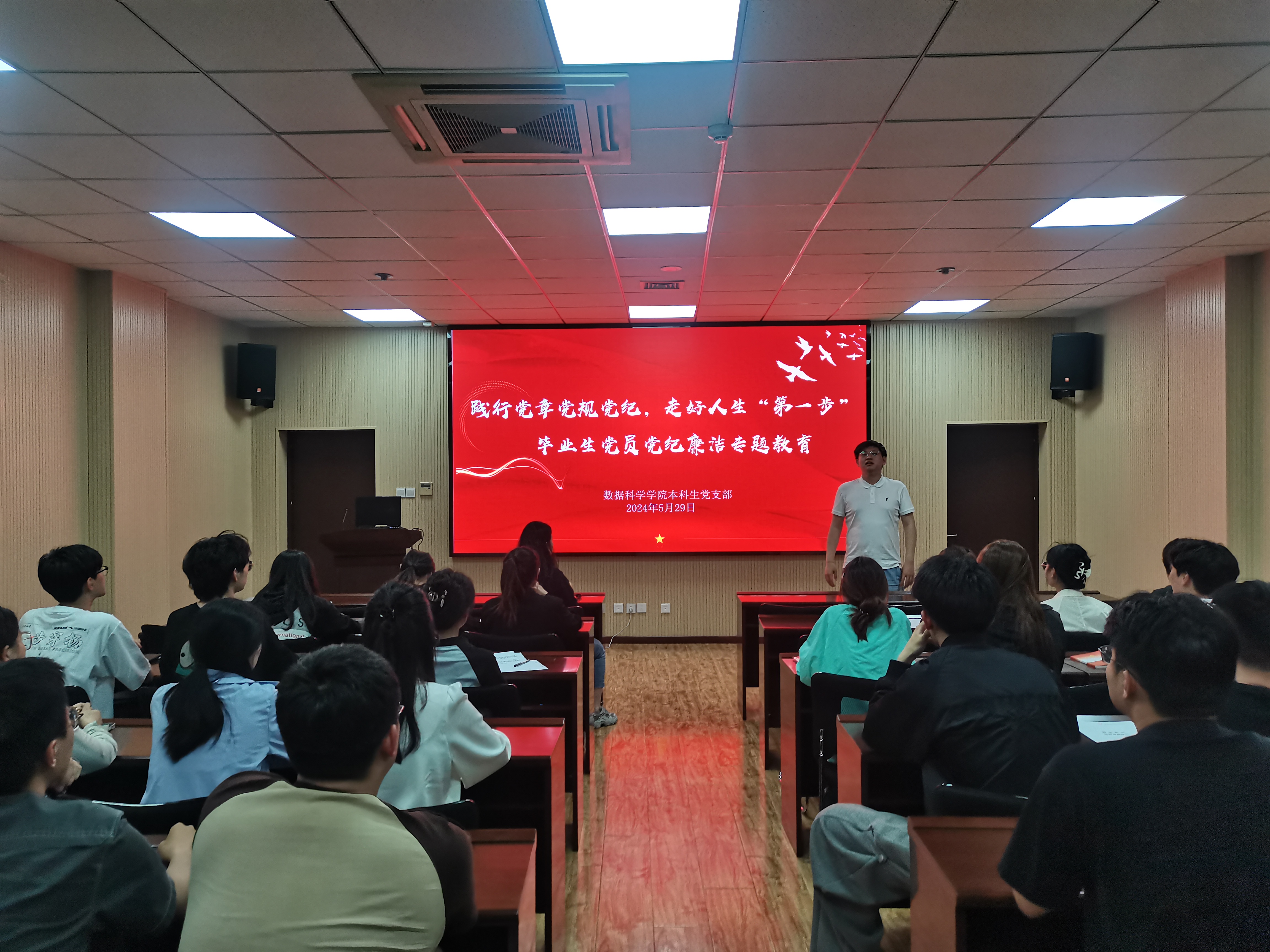党支部书记姜国华以《践行党章党规党纪,走好人生“第一步”》为题,结合典型案例,对《中国共产党纪律处分条例》修订的重要意义和主要内容进行解读,重点阐述了政治纪律、组织纪律、廉洁纪律、群众纪律、工作纪律、生活纪律六大纪律的主要内容和具体要求。向党员们提出了三点希望:一是明德力行,坚定信仰;二是以身作则,树立形象;三是担当作为,勇创佳绩,做对党忠诚的明白人、清正廉洁的干净人、能堪重任的实干人。他提醒毕业生党员,无论是继续深造还是步入职场,在面对各种诱惑时,都应明确自己的行为准则。他强调,全体毕业生党员要以本次党纪学习教育为契机,守住“底线”、不越“红线”、不碰“高压线”,切实做到学纪、知纪、明纪、守纪。