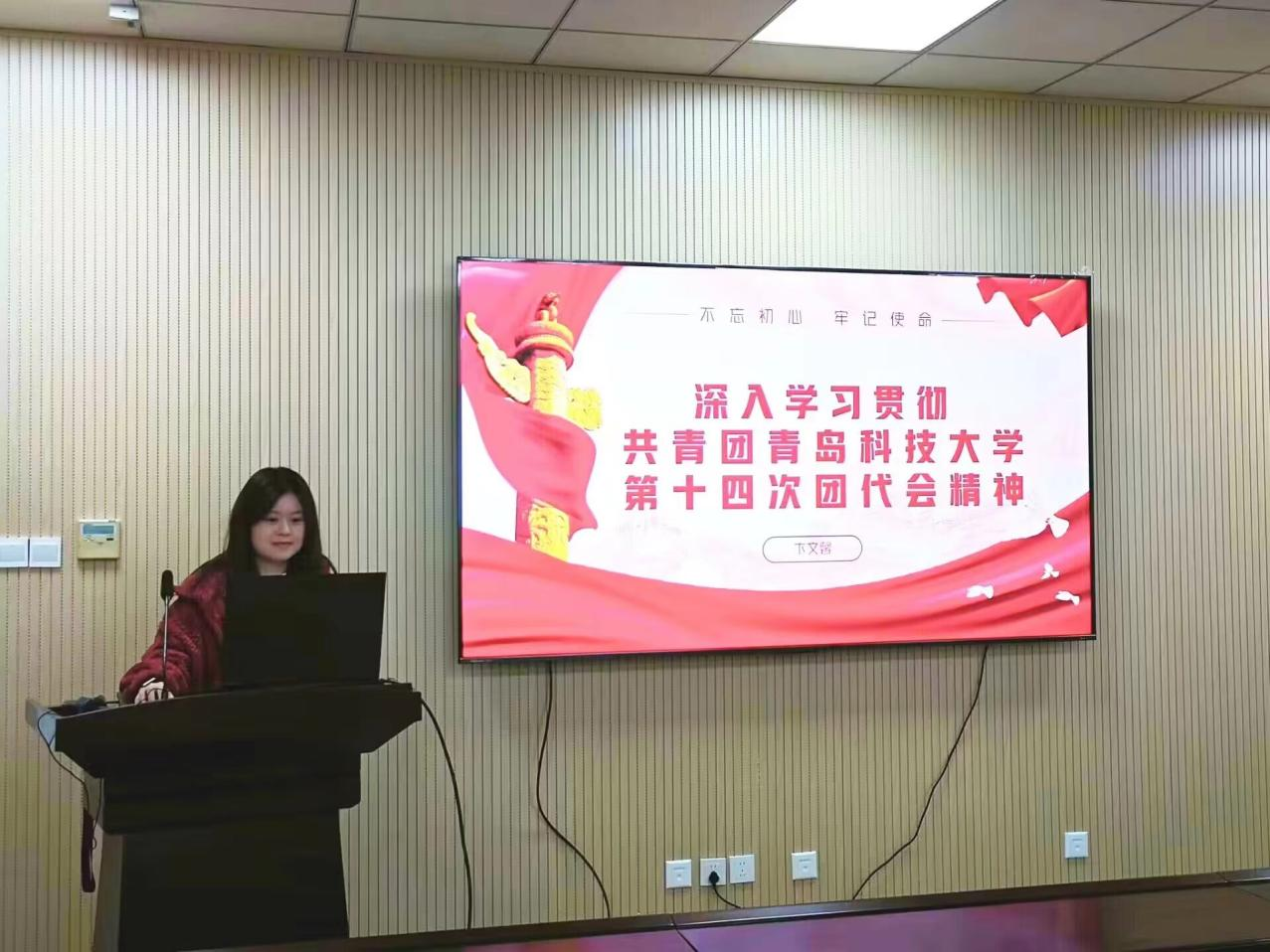团课伊始,卞文馨向同学们简单介绍了学校团代会的主要议程以及召开团代会的重要意义,接着带领同学们学习了校党委书记李兴伟讲话内容以及共青团山东省委副书记尚胜波讲话内容,帮助同学们全面认识了团代会。卞文馨向同学们传达了团代会会议精神,激励同学们高举习近平新时代中国特色社会主义思想伟大旗帜,以党的二十大精神、团的十九大精神和学校第十一次党代会精神为指引,坚定信心、攻坚克难,埋头苦干、真抓实干,奋勇争先、乘势而上,争当伟大理想的追梦人,争做伟大事业的生力军,为学校加快建设“特色鲜明、走在前列”的高水平大学贡献青春智慧与力量,为全面建设社会主义现代化国家、全面推进中华民族伟大复兴而团结奋斗!