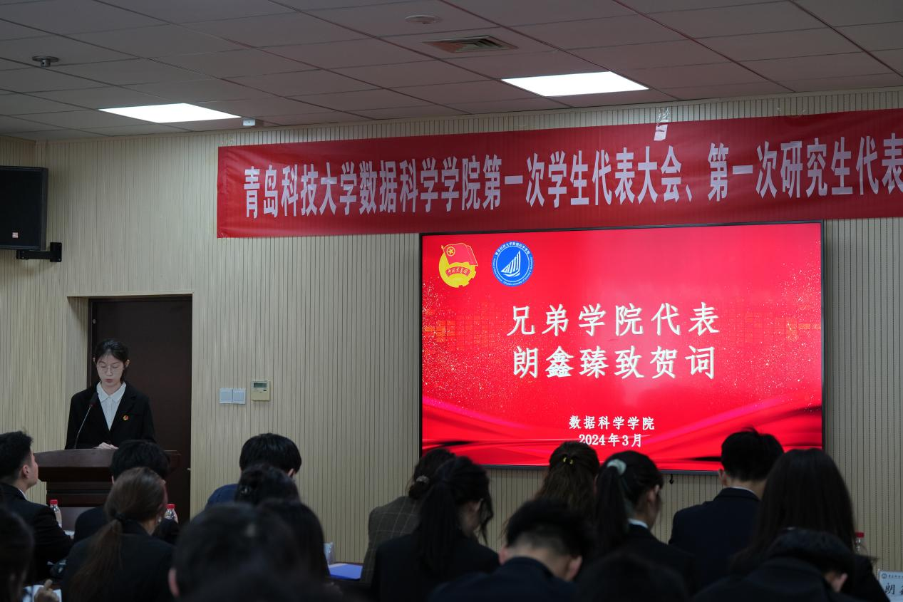接着大会工作人员宣读了各兄弟学院发来的贺电、贺信。朗鑫臻代表兄弟学院高、刘毅代表校学生会分别致贺词,预祝bat365中文官方网站第一次学生代表大会、第一次研究生代表大会顺利召开,圆满成功。