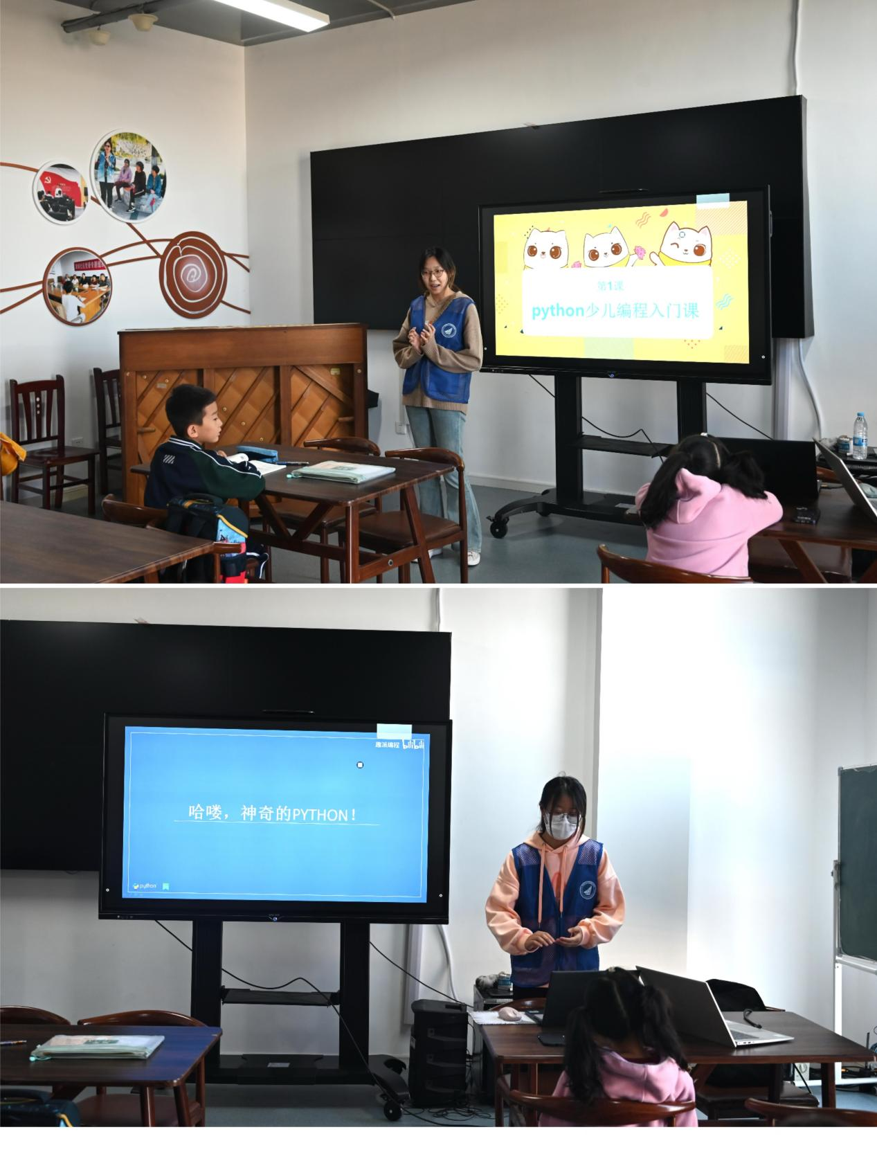 在课程正式开始前,小朋友们先和自己的小伙伴组队,并选择了自己喜欢的老师。本次课程内容分为两个板块,自我介绍和编程讲解。课程正式开始,小朋友积极地向老师进行自我介绍。随后,志愿者们将教学内容运用编程演示在电脑上,大大激发了小朋友们的学习兴趣。