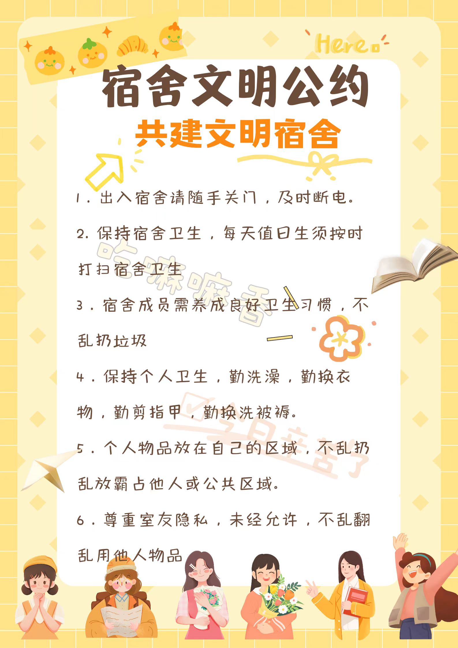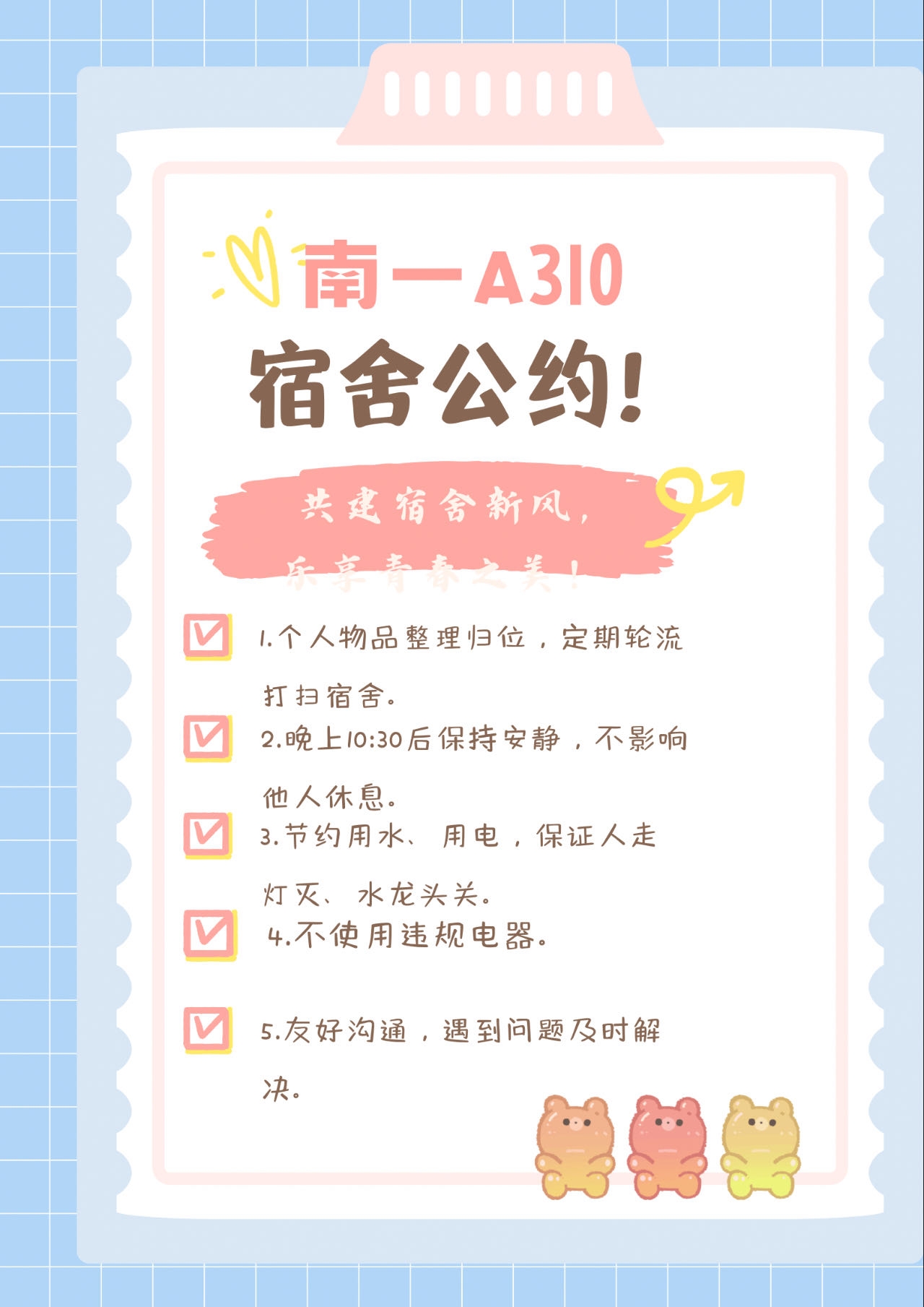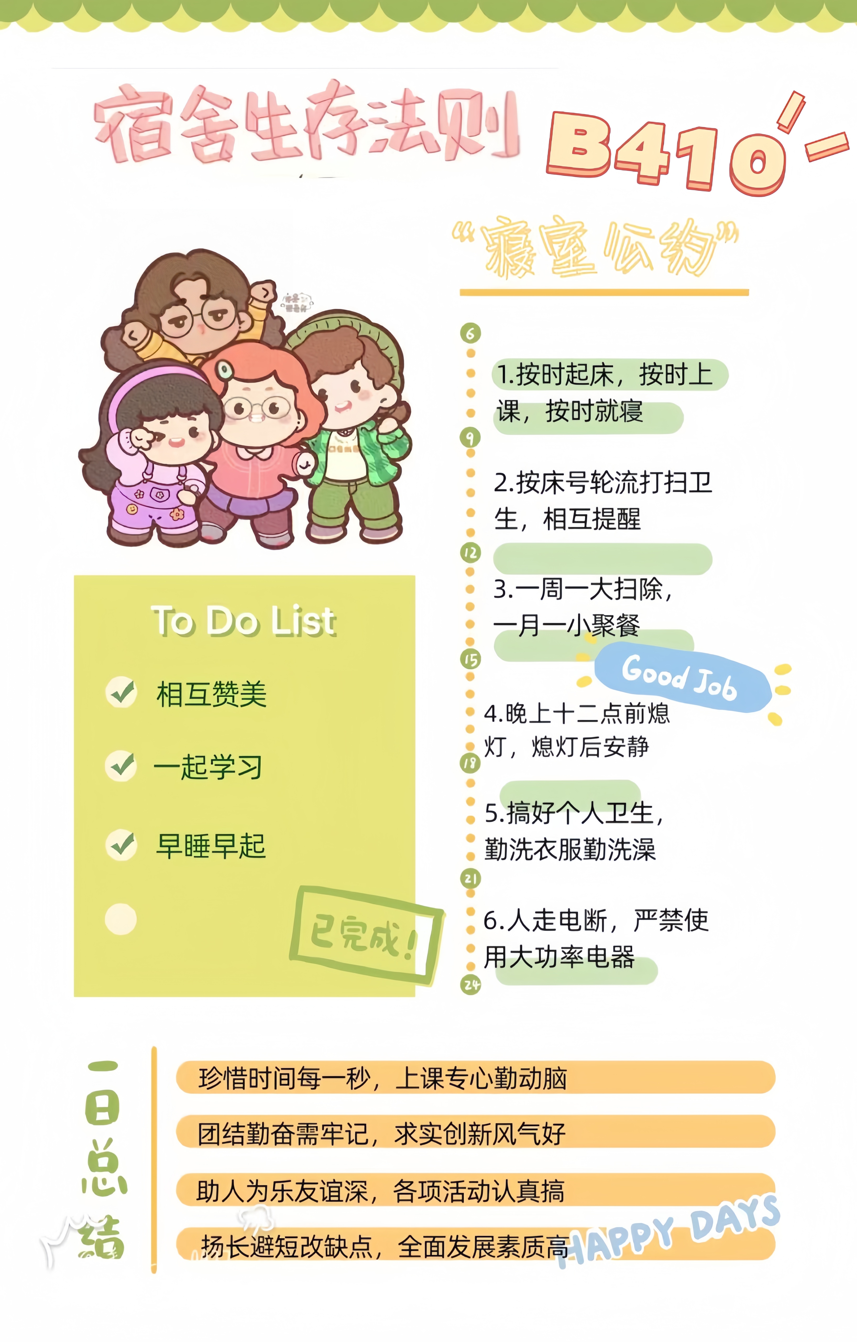 本次大赛自启动以来,就受到了同学们的热烈响应和积极参与。各宿舍成员充分发挥创意,紧密结合日常生活实际,制定了各具特色的宿舍公约。这些公约不仅涵盖了宿舍卫生、作息时间、电器使用等常规管理事项,还融入了团队合作、互相尊重、共同进步等积极向上的价值观。不仅体现了宿舍成员间的智慧和创意,也展现了他们对宿舍文化建设的深刻理解和积极实践。