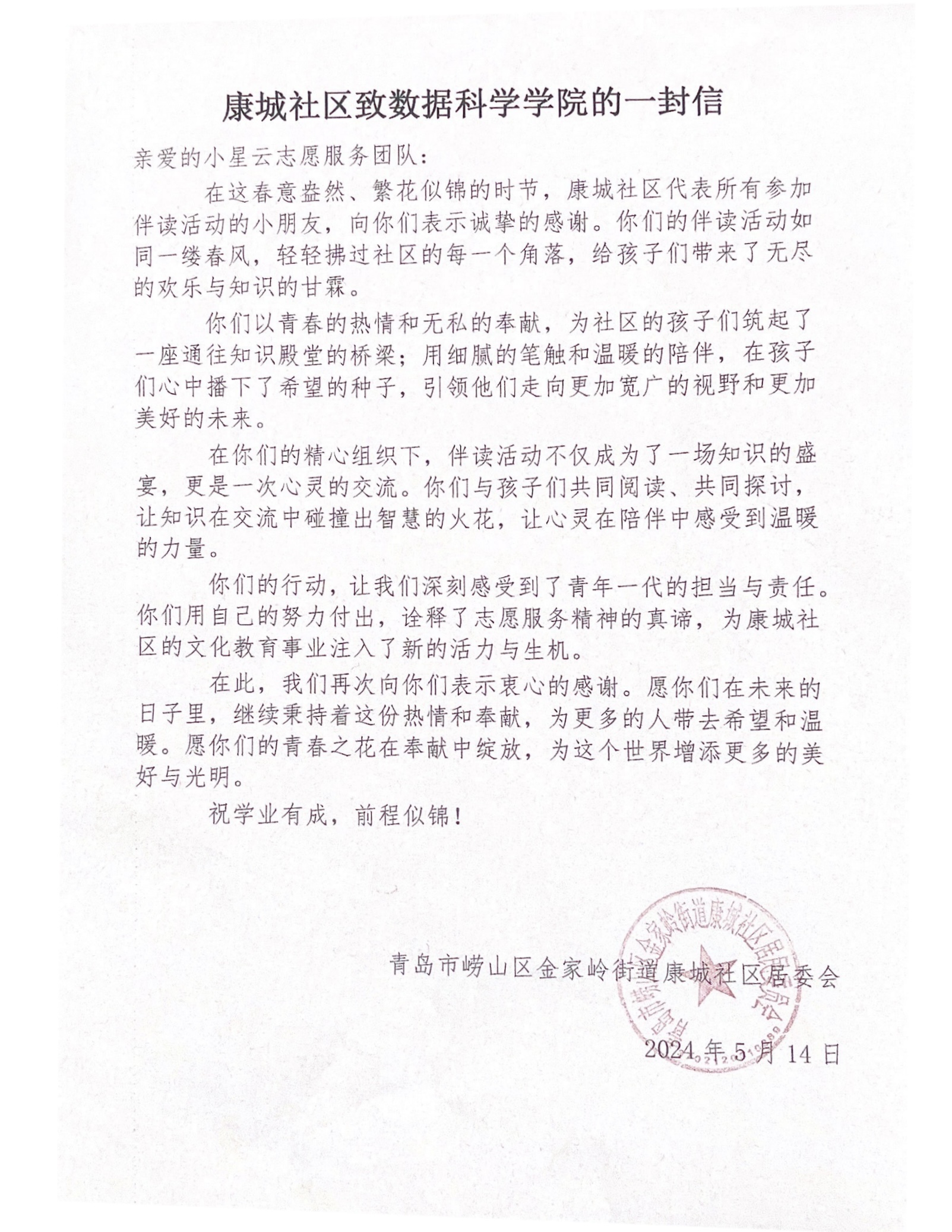 为积极响应团中央“百万大学生进社区”的号召,发挥学校与社区优势互补、人才共育作用,创建更加和谐的社区环境,bat365中文官方网站bat365中文官方网站“小星云”志愿服务队走进康城社区,开展了为期四周的伴读活动。本次活动以“童语飘数科,书香染万家”为主题,旨在通过多样化的阅读和互动体验,激发孩子们对知识的渴望,培养他们的阅读兴趣和创造力。