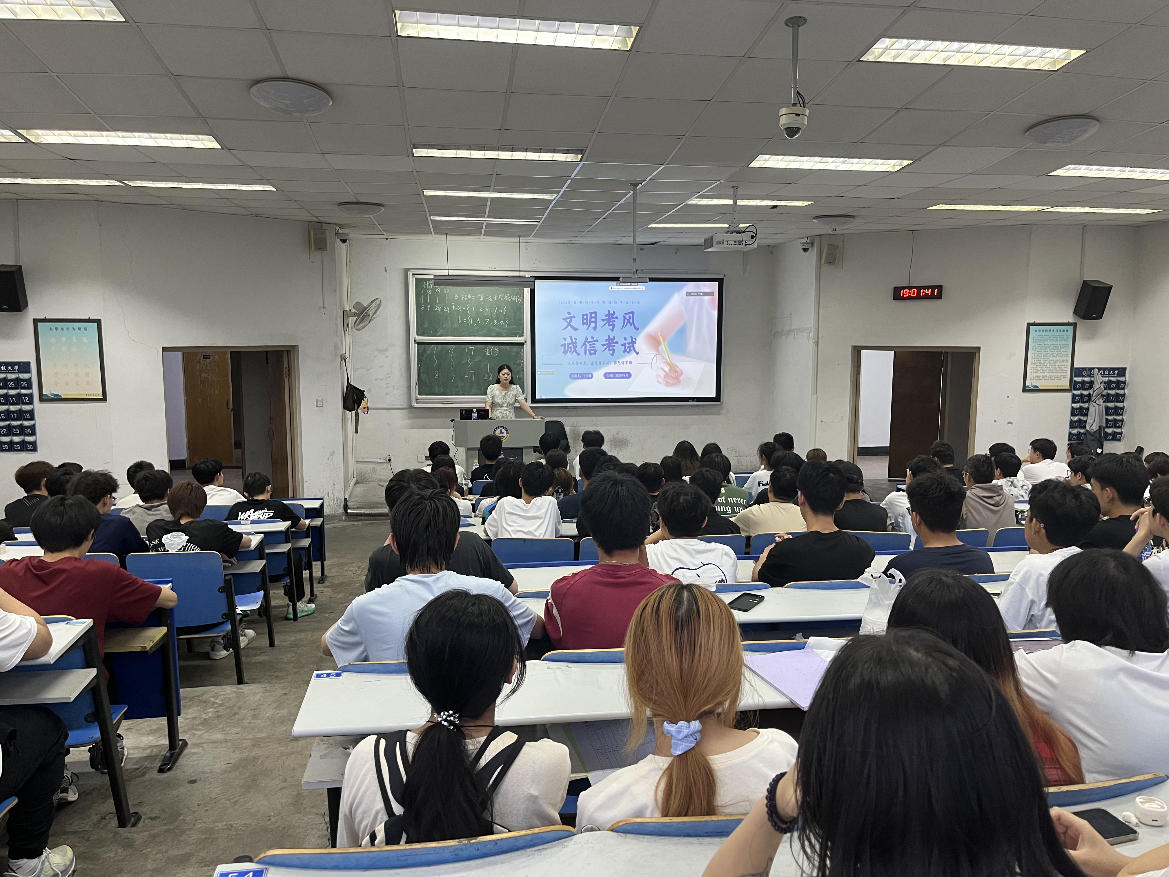 为进一步加强学风建设,营造风清气正的考试环境,6月30日晚,bat365中文官方网站于弘毅楼E101教室召开“文明考风 诚信考试”考风考纪教育大会。此次大会采取线上线下结合的方式,由辅导员卞文馨主讲,2021级、2023级全体学生线下参会,部分学生家长线上参会。