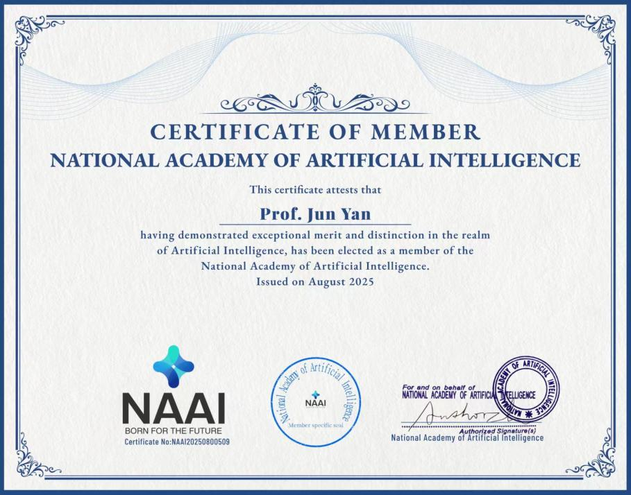 2025年8月,bat365中文官方网站bat365中文官方网站颜军院长成功当选美国国家人工智能科学院(The National Academy of Artificial Intelligence,NAAI)院士。美国国家人工智能学院贺信中高度赞扬了颜军院长在人工智能领域的“非凡成就和开创性贡献”,指出其“创新性研究、深刻见解和坚定不移的奉献精神激励了无数学者和从业者”。颜军院长的加入,将进一步丰富NAAI的学术讨论、科研合作及人工智能领域的全球推进工作。