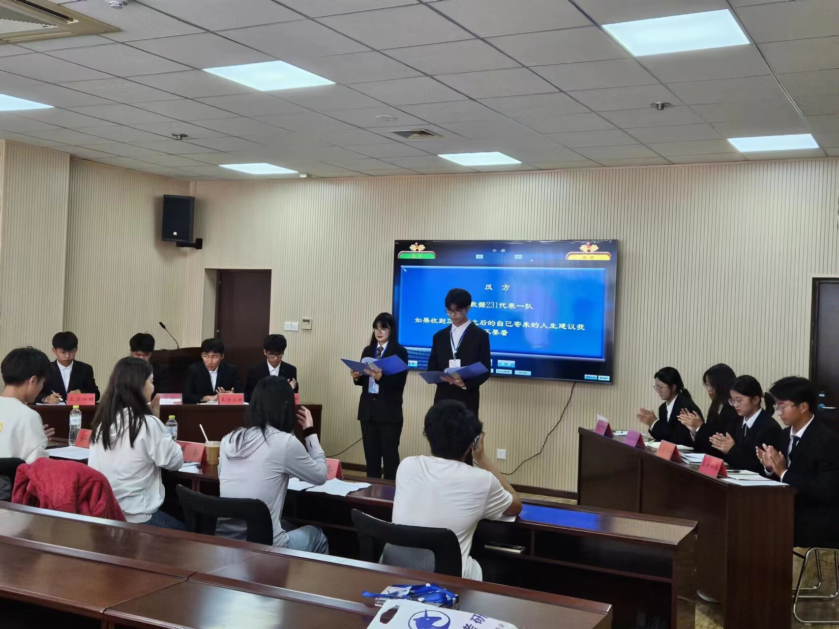 在开篇立论环节,双方一辩条理清晰地陈诉了己方观点。在驳论及对辩环节,双方二辩更是展现了思维的敏捷和言语的犀利,不断抓住对方辩手发言中的漏洞并给予反击。场上不时传出幽默诙谐的语言,引得现场掌声不断,笑声和喝彩声不绝于耳。在随后的盘问环节中,双方更是针锋相对、步步紧逼,现场气氛迅速升温,达到白热化阶段。自由辩论环节中,正方从目前“来自三十年后的建议可以帮助自己解决当下的问题”为突破口展开辩论。反方也毫不示弱,他们通过“蝴蝶效应”引出“看了建议之后建议会在潜意识中掌控自己的人生”的观念。最后总结陈词环节。双方四辩清晰的思路和巧妙的陈词给观众留下了深刻印象。