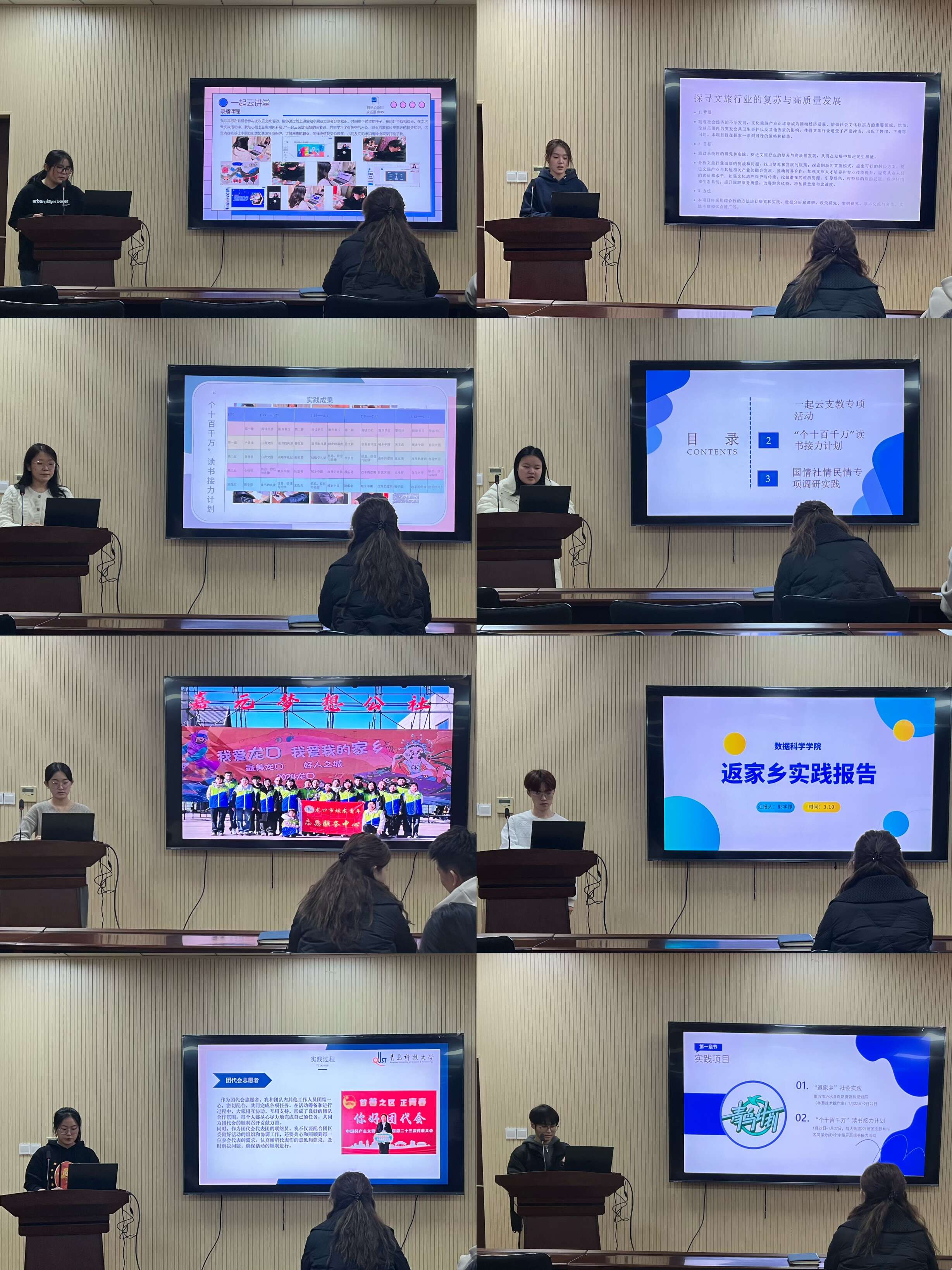 分享会上,同学们依次上台,结合PPT详细分享了他们在“青鸟计划·引凤归巢”实践活动、一起云支教专项活动、“趁青春·进社区”大学生社区实践计划、“个十百千万”读书接力计划、“返家乡”社会实践等多个社会实践活动中的实践过程,也分享了在实践中获得的宝贵经验和感悟。在分享过程中,同学们用自己的实践经历,生动地诠释了“实践出真知”的道理,也展现出了数科学子勇于担当、敢于实践的精神风貌。