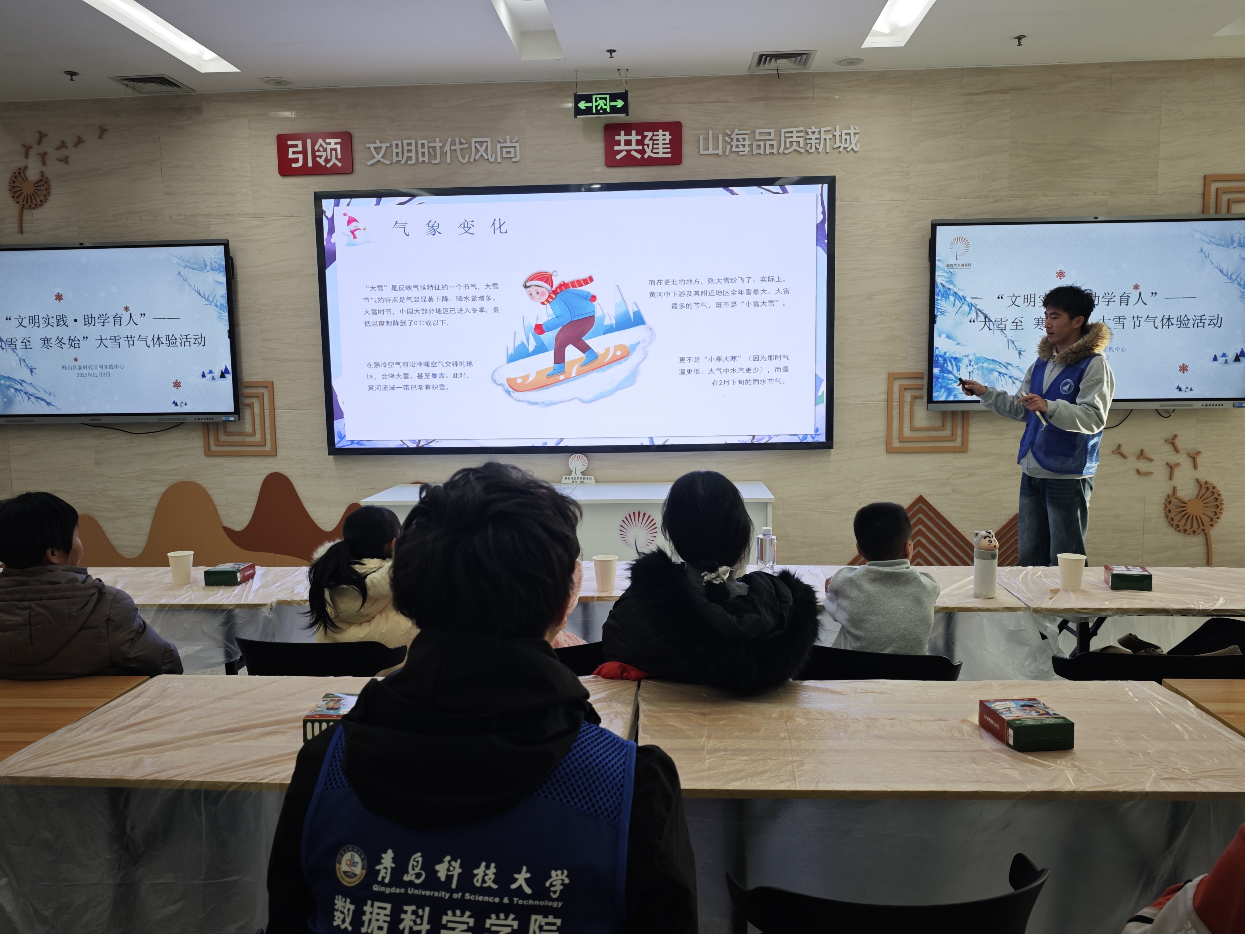 活动期间,志愿者团队依托精心制作的PPT课件,以通俗易懂、生动活泼的语言,向孩子们系统普及大雪节气相关知识。从节气名称的历史渊源和气候特征的科学原理,再到“瑞雪兆丰年”等经典谚语及诗词典故,志愿者们将抽象的传统文化知识转化为具象化表达,引导孩子们沉浸式感受冬日节气的独特韵味,现场学习氛围浓厚,互动反响热烈。
