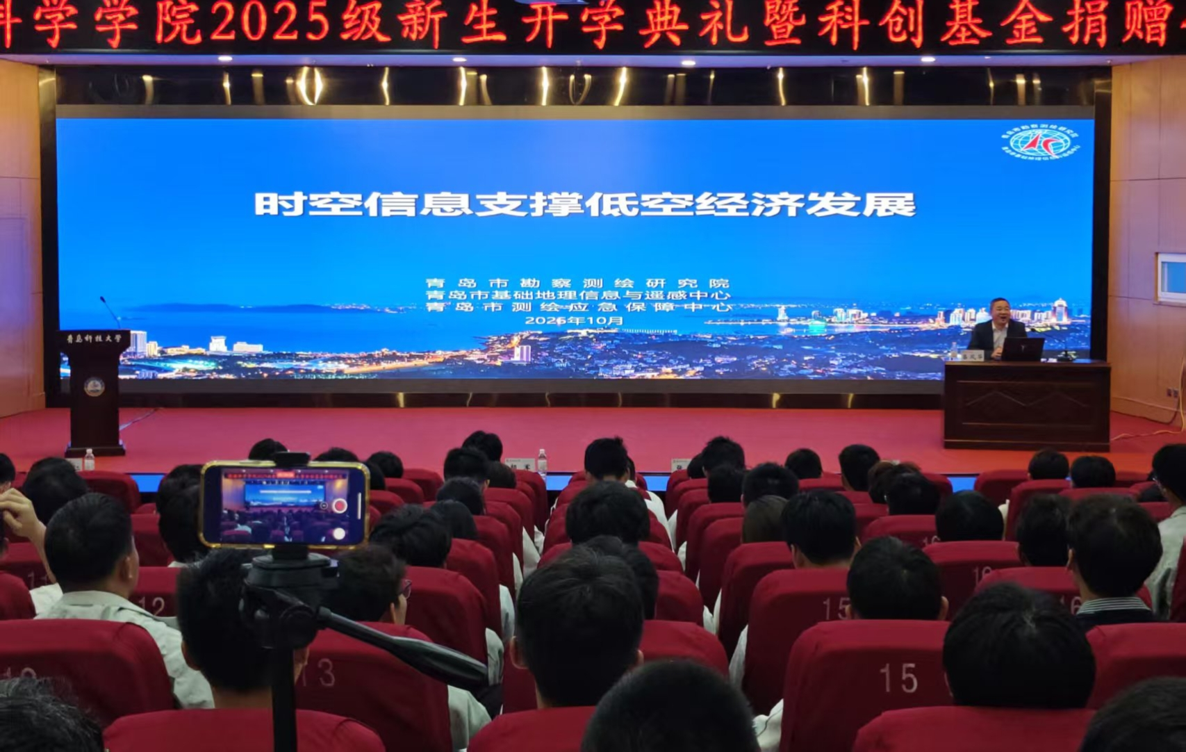 开学第一课《时空信息支撑低空经济》由青岛市勘察测绘研究院时空战略研究室技术主管吕凤华主讲,学院常务副院长杜军威主持。吕凤华从低空经济内涵、支撑技术、应用场景展开讲解,阐述时空信息在低空飞行器定位、农业、应急救援等领域的关键作用,让新生深刻领悟专业与前沿产业的紧密联系。