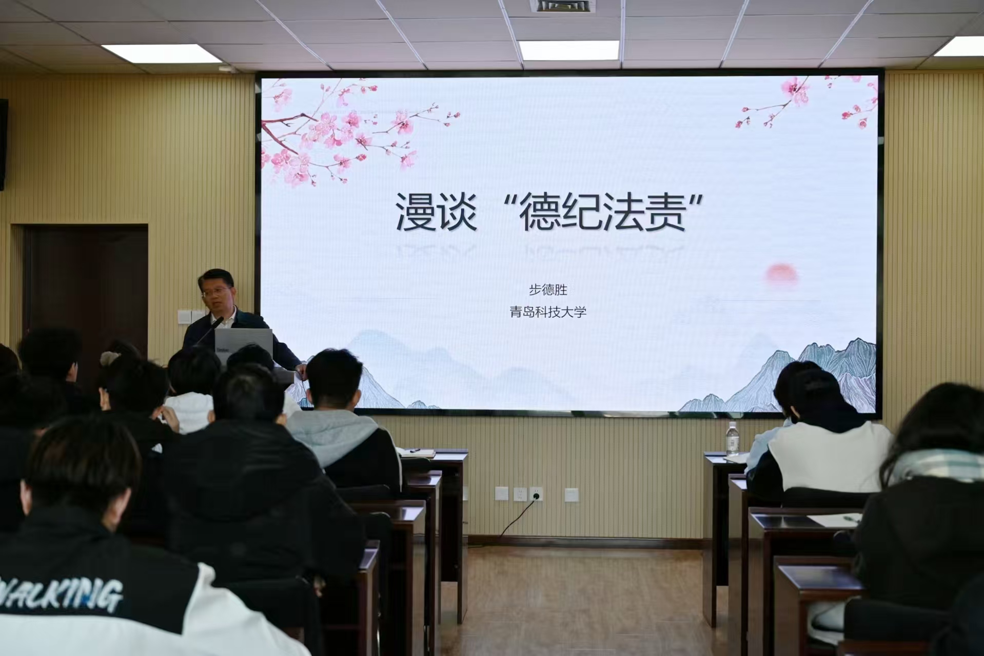 步德胜以《漫谈“德纪法责”》为主题,为同学们进行了一场深入浅出的讲座。他详细阐述了“德纪法责”四个字的历史起源、现实内涵,同时结合具体事例,从“道德”“纪律”“法治”“责任”四个方面,阐述了其对于培育社会主义核心价值观的重要性,鼓励同学们要树立正确的道德观念,自觉践行社会主义核心价值观,为构建和谐社会贡献力量。