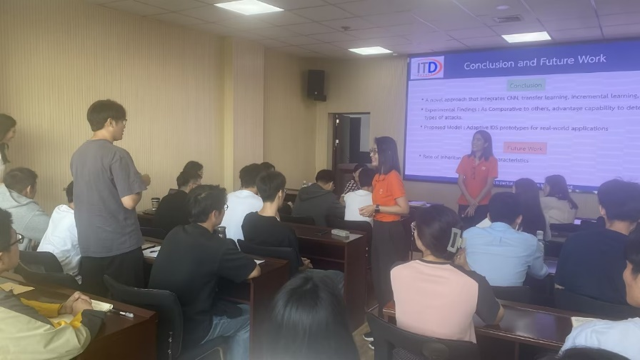 Sunantha Sodsee教授在题为《Applying Modified Convolutional Neural Networks for Detecting Intrusion》的报告中,介绍了一种从传统机器学习向深度学习转型的网络入侵检测方法。该方法将网络流数据转化为图像,并利用增量学习实现对入侵攻击类型的分类,显著提升了入侵检测的准确率和效率。Sodsee教授用启发式方法,深入浅出地给在场的师生分享了这项创新工作的动机和过程,同学们积极互动交流,为未来的合作奠定了良好的基础。