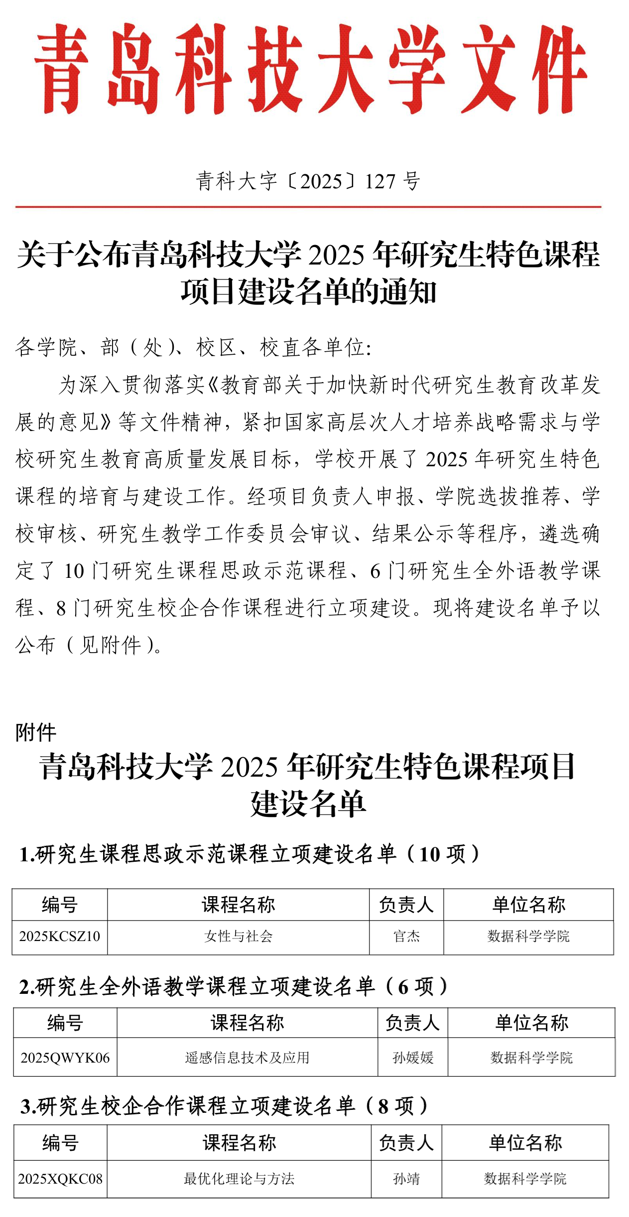 在此次立项中,bat365中文官方网站官杰老师负责的《女性与社会》入选“研究生课程思政示范课程”,孙媛媛老师负责的《遥感信息技术及应用》入选“研究生全外语教学课程”,孙靖老师负责的《最优化理论与方法》入选“研究生校企合作课程”。这三门课程的立项,充分体现了bat365中文官方网站在课程内容设计、教学方法创新以及产学研融合方面的积极探索与成果。