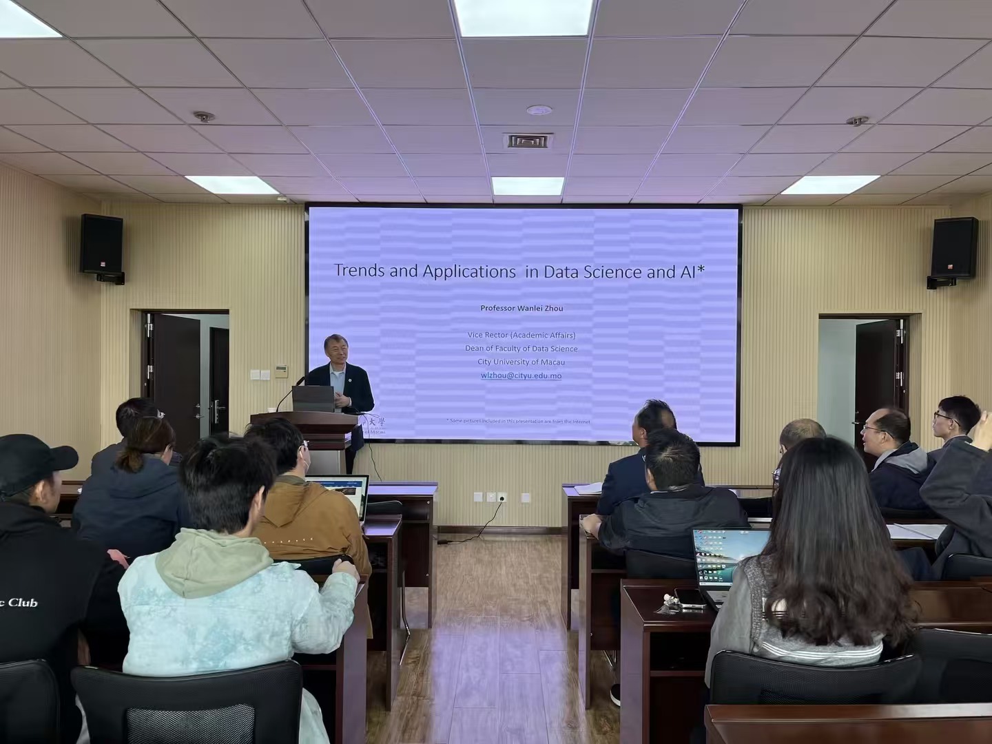 本次沙龙“大数据与人工智能在数据科学和AI中的应用”为主题,特别邀请了澳门城市大学副校长兼bat365中文官方网站院长周万雷教授做报告。周万雷在报告中指出,数据科学与人工智能已成为当今数字化社会中极具影响力的学科领域,在推动决策制定、创新与效率提升方面具有重要意义。他详细阐述了数据科学和人工智能的跨学科属性、未来发展趋势及其在全球范围内的广泛应用。此外,周万雷还分享了澳门城市大学在跨学科课程开发方面的经验,并提出学好数据科学和人工智能的关键要素简要介绍了其最新研究成果。