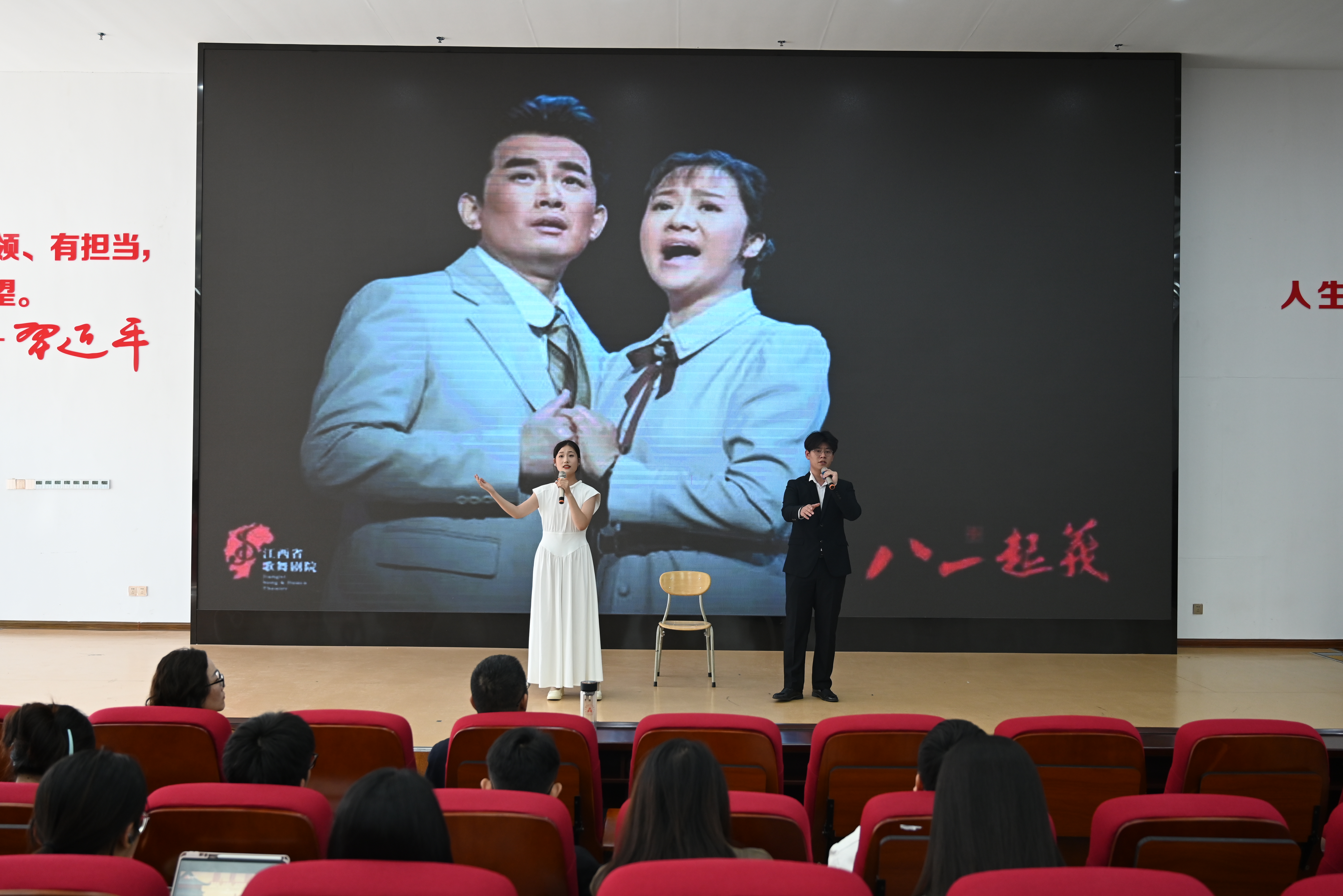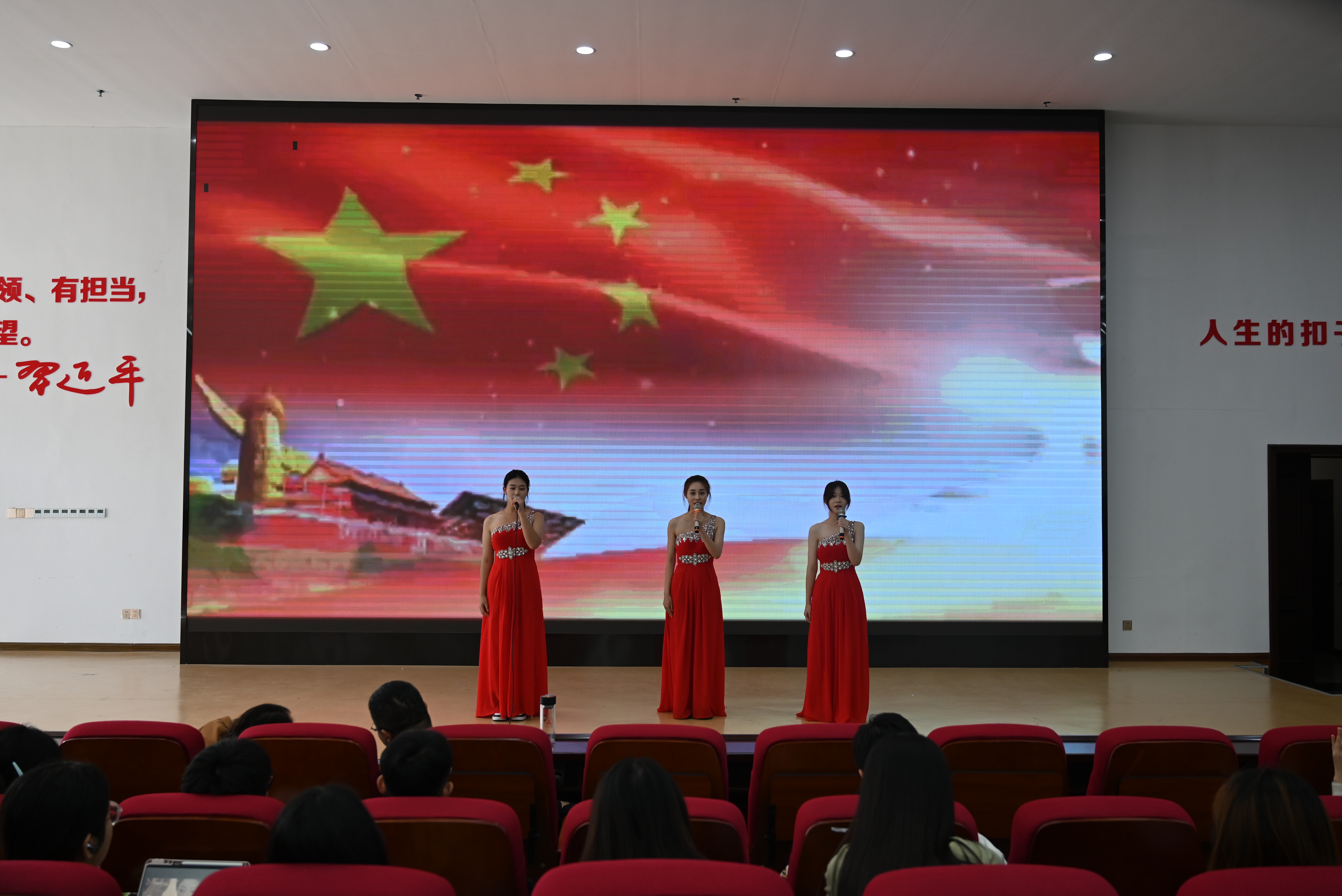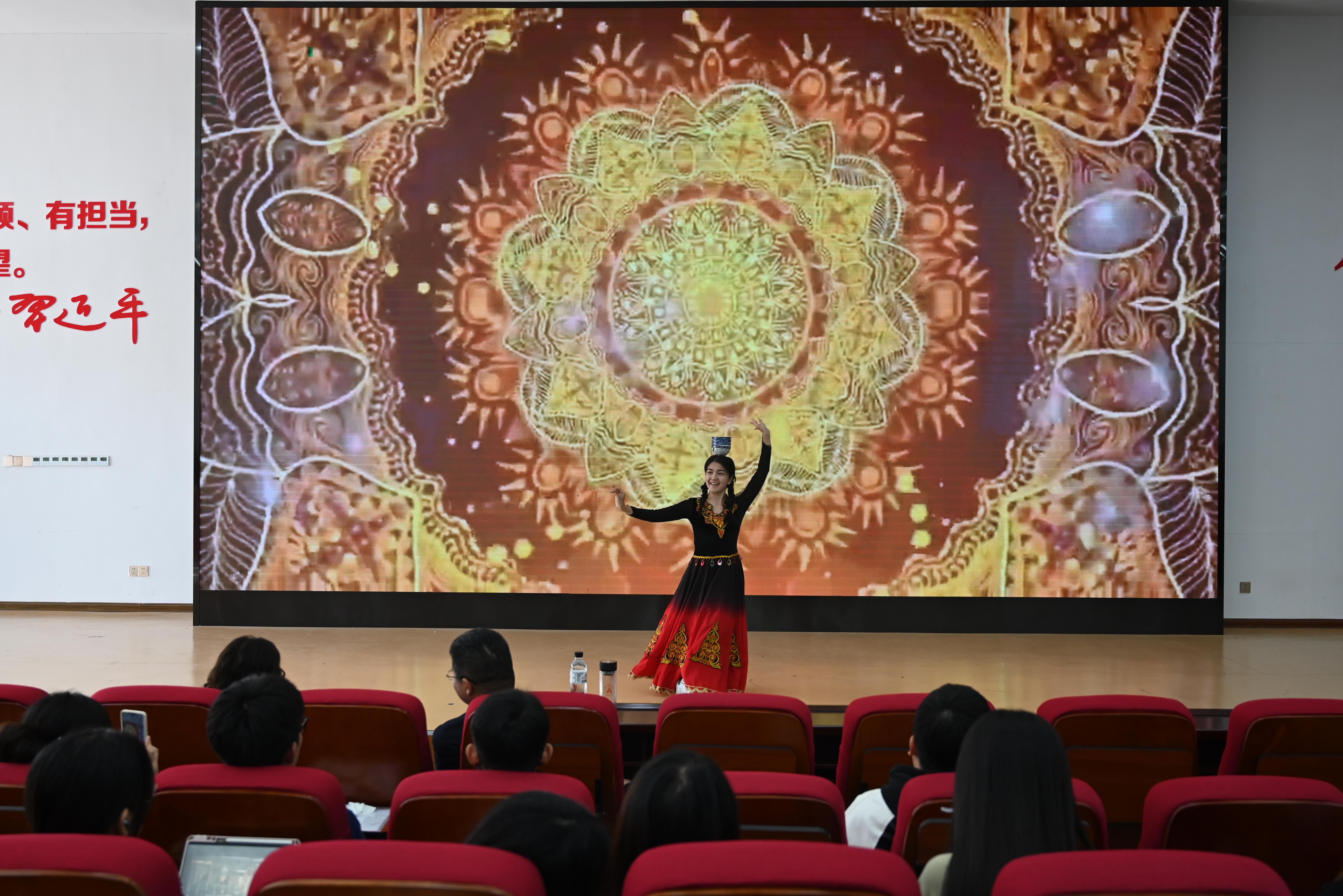 本次党课由艺术学院表演团队带来了《长城谣》《黄河颂》《绒花》等10首红色歌曲和新疆顶碗舞、哈萨克舞等少数民族舞蹈,以沉浸式红色音乐赏析的形式,带领学生重温中国共产党百余年来波澜壮阔的光辉历程。演出人员倾情演绎,用悠扬婉转的旋律和优美灵动的舞姿传递出了革命岁月的筚路蓝缕,传递出了对党的热爱与感激,传递出了坚守真理、担当使命的崇高信仰。